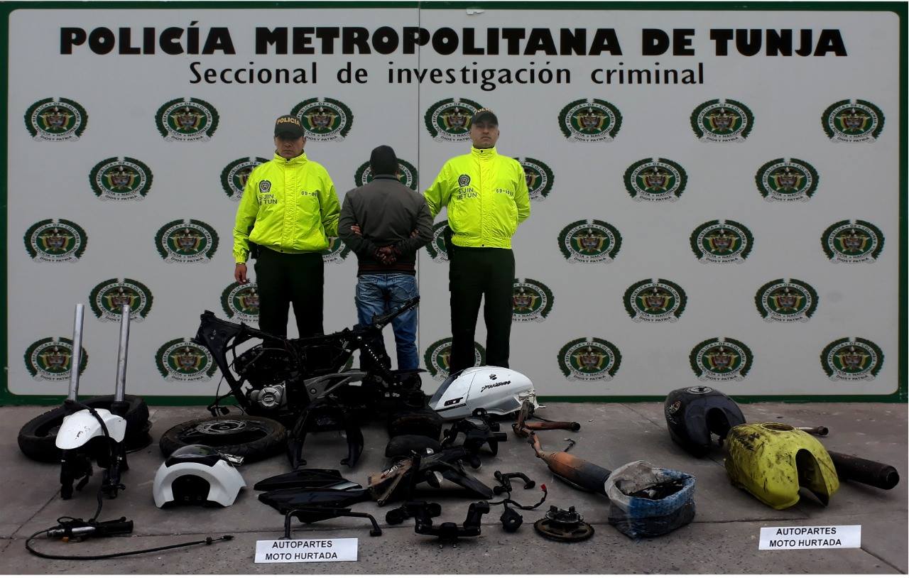 Motavita - la Policía Metropolitana de Tunja, lograron en las últimas horas, la captura en flagrancia de una persona por el delito de receptación, la recuperación de una motocicleta hurtada y varias autopartes de vehículo.