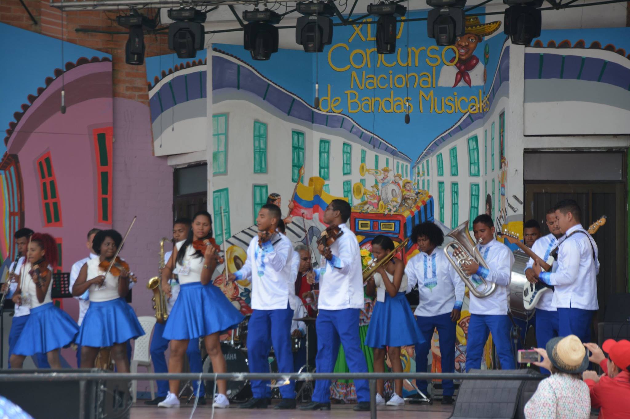 La lluvia hace que los 48 músicos de la Banda Sinfónica de Cundinamarca cojan sus instrumentos y se acomoden con sus violines, clarinetes, saxofones, trompetas, entre otros, en un espacio improvisado para seguir el show. El director Miguel Ángel Casas levanta su mano derecha y en sincronía, todos comienzan a ejecutar las notas de 'Colombia tierra querida'.