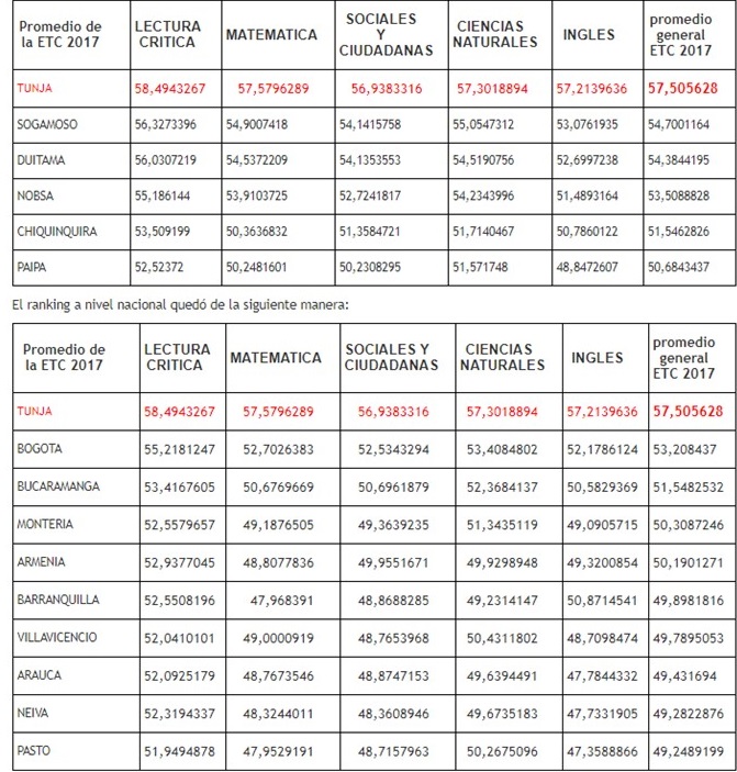 Según reporte de resultados agregados Saber 11º Tunja también ocupa el primer puesto a nivel departamental.