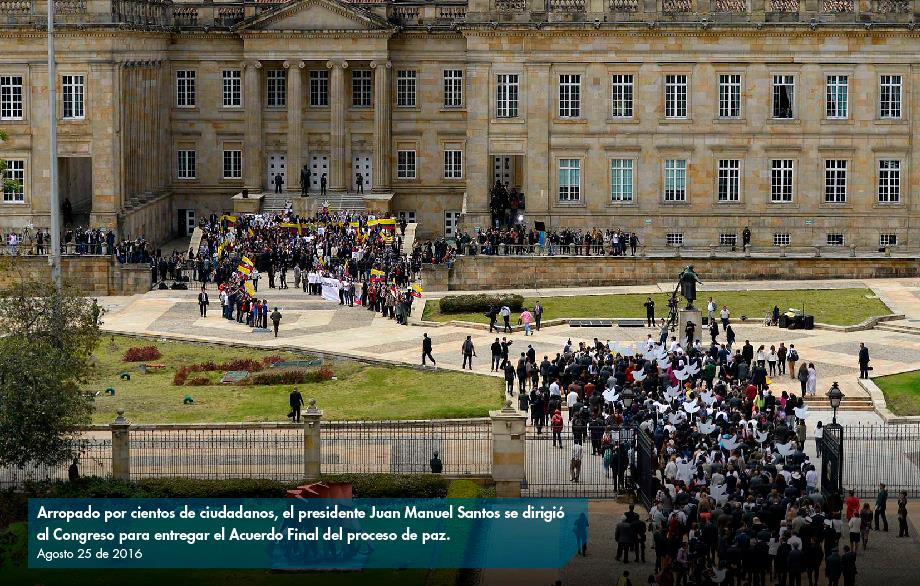 Menos de 24 horas después de la rúbrica de los acuerdos logrados en la mesa de negociaciones, el presidente de Colombia, Juan Manuel Santos, presentó al Congreso el texto definitivo como requisito para la convocatoria de la consulta popular.